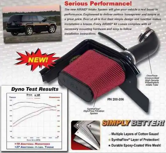 Dyno testing conducted at Airaid have proven again and again the potential gain of up to 21 horsepower and 18 ft/lbs of torque with a simple installation of one of their Airaid Air Intake Systems.