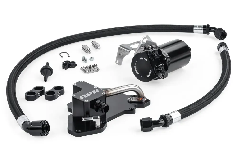 The APR Catch Can System with PCV Plate is a comprehensive upgrade to your engine’s Positive Crank Ventilation (PCV) system. This factory-racecar-inspired-system takes a multi-step approach to addressing several performance robbing issues, and critical engine safety concerns, with the factory system. The basis for the system is simple: Your engine’s factory PCV system has several issues. The APR Catch Can System with PCV Plate addresses each one.