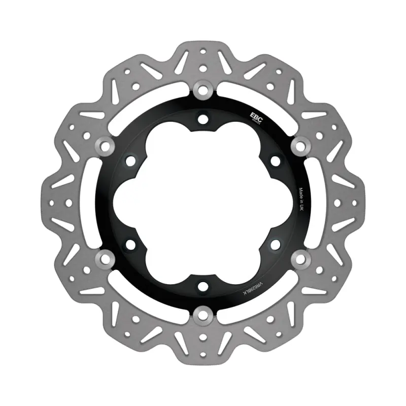 EBC Brakes™ Vee-Rotors™ Replacement Discs are British made discs using German mill rolled precision stainless steel rotor blades with a VEE profile weight reducing profile mounted onto lightweight alloy center hubs, using the patented SD square drive button technology.