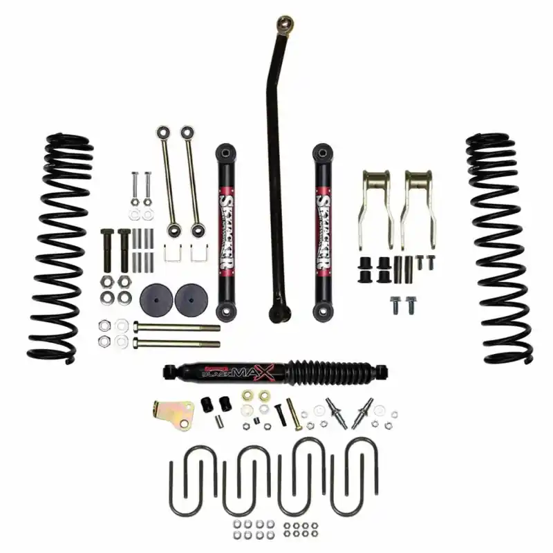 Longer replacement Front Lower Control Link Arms have pressed-in HD OEM style vulcanized rubber bushings at each end and correct caster angle. Front Sway Bar End Links allow full articulation at full droop. Front Bump Stop Spacers bolt onto axle bump pads to keep the suspension travel safely in check. Front Adjustable Track Bar features a 3/4 in. Teflon(R) self-sealing self-lubricating rod end and mounting bracket with hardware. Replacement Steering Stabilizer allows unrestricted gradual movement but resists sudden shock. Longer replacement rear leaf spring shackles increase the performance of the leaf springs by giving them more room to travel and to flex. Replacement Rear U-Bolts with Mounting Hardware. Complete with all needed Bushings and High-Grade Mounting Hardware. Skyjacker’s engineered processes achieve maximum wheel travel, ride quality and long-lasting life. Reap the benefits: On-Road Refinement and Off-Road Readiness.