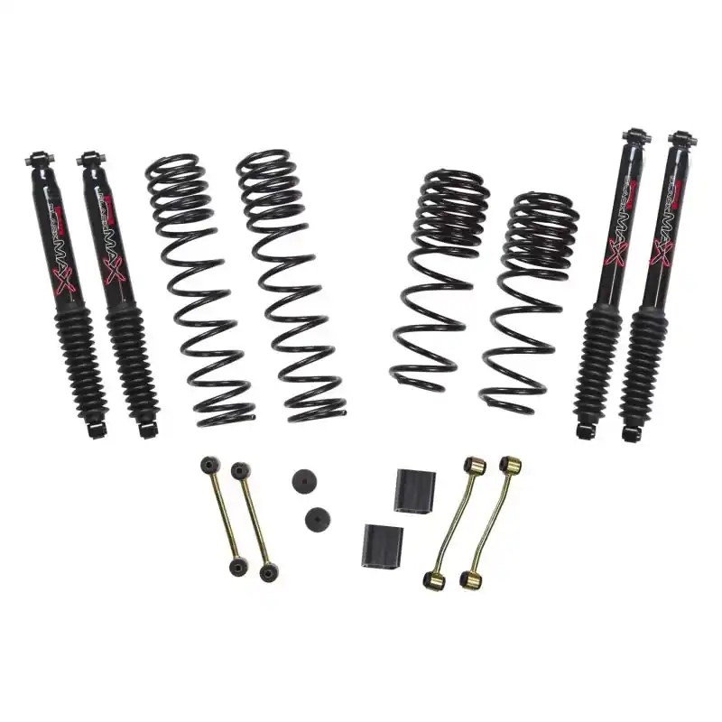 The biggest determining factors in ride quality and suspension performance are coil springs and shocks. Skyjacker specifically engineered a progressive variable rate coil spring, distinctively a 2-stage dual rate long travel coil. Spring rate progression is from a 1st Flex Rate to a 2nd Ride Rate. The 1st Flex Rate stage delivers a comfortable ride with the ability to flex for increased articulation. The flex rate expands during full articulation as the suspension drops (full droop). This keeps the coil springs seated in the upper coil mount/bucket and the tires in contact with the terrain. The 2nd Ride Rate stage only engages after compression past the flex rate. Engineered to coordinate with the Wranglers distinctive suspension handling characteristics, the rear coils are side specific. Shocks are a key link in-between the chassis and your suspension. Their key role is to dampen out or control the terrain to keep your tires in contact with the terrain. Front damper capacity enhanced with Black MAX Shocks. Black MAX Shocks have specific valving and stroke for this application. Black MAXs Advanced Foam-Cell technology increases performance and style to deliver a smooth, comfortable ride. Front and Rear Bump Stop Spacers bolt onto the axle bump pads and keep the suspension travel safely in check. Front and Rear Extended Length Sway Bar End Links allow full articulation as the suspension drops (full droop). These sway bar end links include Skyjacker installed pressed-in HD OEM style rubber bushings. Proper suspension geometry ensures the Electronic Stability Control (ESC) system functions within factory parameters.