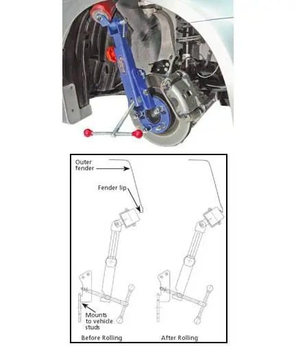 Increases tire to fender clearance. Adjustable forming roll gradually rolls inner lip flat. Non-Marring Delrin�forming roll preserves original finish. Adjustable arm length fits a wide range of automotive and light truck applications. Durable heavy steel powder coated construction.