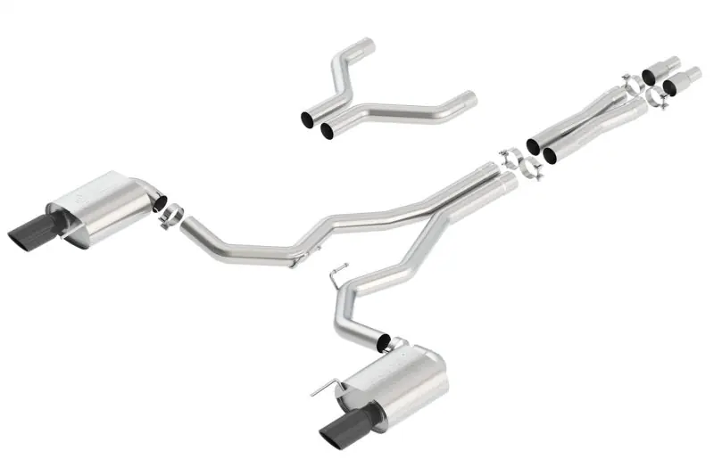 EXCEPT Convertible. Recommended only for vehicles with substantial engine upgrades that require a 3″ exhaust. System contains a merge X-Pipe for increased performance and improved sound. This system features the aggressive ATAK(r) sound and exits through 4″ black chrome on T-304 stainless steel tips. Using Borla(r) Sta